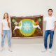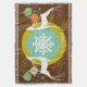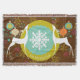 Beautiful Christmas holiday throw blanket features a background of dark brown with colourful snowflakes, a ring of solid mustard yellow, and a centre of aqua blue with tiny white polka dots and a big snowflake centre. Two white silhouette deer and pretty tree ornaments adorn this whimsical holiday throw and there's an area you can easily personalise with your family name.
