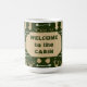 This is a cute mug which is perfect to use for a guest at a cabin or woodland home. It features a pattern of light gold buck deer head silhouettes and white arrows on a background of dark forest green. At the centre is a matching label with your custom text, also in dark forest green. Currently it says "WELCOME to the CABIN" but you may easily customise it to your own text.
