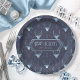 This paper plate features a trendy pattern of deer head silhouettes with curving antlers, stylized arrows and tiny snowflakes in shades of sky blue and slate on a navy blue background. Optional 'Happy Holidays' text and a label have been provided to add your name and/or other text. Search ID861 thru ID864 to see additional color options and other products in this modern, Christmas design set.