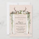 Design features a printed coloured foliage element in shades of green overlaying a tan kraft paper textures with deer antlers and a white canopy top with calligraphy script or type writing. Great for your wedding celebrations!