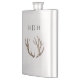 Silver flask with deer antlers and monogram initials.  Add first, middle and last name initials in dark grey over the image of a pair of antlers.  Gift ideas for a hunter, woodsman, or any guy.