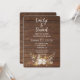 Glowing light string in deer antler floral bouquet on rustic brown wood for an autumn wedding vow renewal invitation.