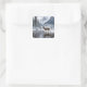 A beautiful landscape featuring a deer beginning to cross a river in winter, surrounded by majestic mountains and snow-laden trees. Perfect for anyone who loves nature and the outdoors.