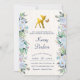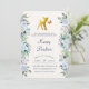 A gold foil baby deer and butterfly sit in between a frame of beautiful blue watercolor flowers with a light wood background. A wonderful woodland theme baby shower invitation.