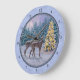 A whitetail buck and doe stand in a clearing surrounded by a forest of fir and pine trees, their branches heavy with snow. In the middle of the clearing is a Christmas tree decorated with warm holiday lights glowing through the snow to brighten the dark winter night. Realistic artwork created from an original oil painting by wildlife artist Crista S. Forest.