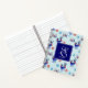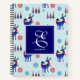 A sprial notebook with a repeating pattern. Illustrated with a pair of blue scandinavian deer wearing red scarves. With decorative markings on their bodies. As well as a trio of red and blue christmas trees with a star on top. Fancy snowflakes sprinkled around. A square layered over top with your personalised monogram initial and name.