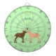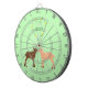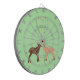 This awesome dart board features a male and female deer that look like a couple in love. The male deer (buck) is dark brown and has large antlers, the female deer (doe) is paler brown with white spots. There is a heart above the deer made of white daisy flowers and yellow buttercups.