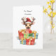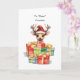 The deer wears a jaunty Santa hat, exuding a playful elegance that captures the spirit of the season. Surrounding the deer are mounds of brightly wrapped presents, forming a colourful cascade of joy and excitement. Perfect card to send your cousins this holiday season.