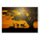 A small herd of deer settle down for the night under an enormous oak tree with a blazing sunset behind them.