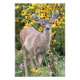 Photo of a deer fawn standing in front of a garden full of black-eyed susans, looking very innocent.