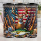 This image presents a striking display of hunting and fishing themes against a weathered American flag backdrop. A regal deer head with prominent antlers is centred, while a large, vibrant bass lies at the bottom. Various rifles and fishing gear, including lures and reels, are meticulously arranged around the central figures, all set against a rustic wooden wall.
