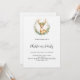 An elegant white background. Decorated with a green pine wreath and a cute deer. Christmas Party written with modern and trendy large hand lettered style script. Personalise and add your party information.