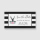 Save the date wedding magnet with a black deer head with large antlers. Geometric lines inside the face of the deer adds a creative touch. Colourful pink flowers and mint green leaves form a pretty floral bouquet below his head. A mountain range sketch placed amongst the flowers also adds to the rustic country feel. Background is a black and white striped pattern.