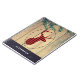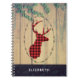 Notebook with a rustic style. Designed with a deer head with antlers, made of red plaid. A fancy oval frame surrounds the image. An image of wood planks for the background gives it an outdoorsy country feel. The bottom border has a dark blue pattern with sprigs and leaves with a personalised name written over top.