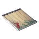 Personalised notepad with a rustic style. Designed with a deer head with antlers, made of red plaid. An image of wood planks with green ivy leaves for the background gives it an outdoorsy country feel. The top border has a dark blue pattern with sprigs and leaves.
