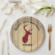 Birthday party paper plates with a rustic style. Designed with a deer head with antlers, made of red plaid. Faux wood planks for the background give it an outdoorsy country feel.