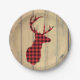 Paper plates with a rustic style. Designed with a deer head with antlers, made of red plaid.  An image of wood planks for the background image give it an outdoorsy country feel.
