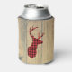 Personalised can cooler with a rustic style. Designed with a deer head with antlers, made of red plaid. An image of wood planks for the background gives it an outdoorsy country feel.