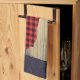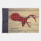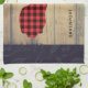 Personalised kitchen towel with a rustic style. Designed with a deer head with antlers, made of red plaid. An image of wood planks for the background gives it an outdoorsy country feel. The bottom border has a dark blue pattern with sprigs and leaves.