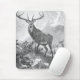 Beautiful black and white vintage illustration of deer in the high mountains. A male deer with antlers is followed by two other deer on the side of a mountain with mountains in the distance. circa 1890s Thiele