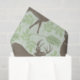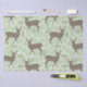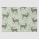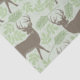 Deer with antlers profile silhouette set on distressed green background with floating compound leaves and pine needles in a repeating pattern.