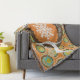 Beautiful Christmas holiday throw blanket features a background of vintage orange with colourful snowflake orbs, a ring of solid dark brown, and a centre of orange with tiny white polka dots and a big snowflake centre. Two white silhouette deer and pretty tree ornaments adorn this whimsical holiday throw and there's an area you can easily personalise with your family name.