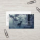 Business cards with a photo of a regal deer with antlers standing in a shadowy forest among sunlit trees. Snow falling all around.