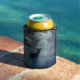 Can cooler with a photo of a regal deer with antlers standing in a shadowy forest among sunlit trees. Snow falling all around.