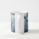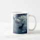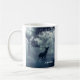 A mug with a photo of a regal deer with antlers standing in a shadowy forest among sunlit trees. Snow falling all around.