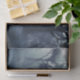 Tissue paper with a photo of a regal deer with antlers standing in a shadowy forest among sunlit trees. Snow falling all around.