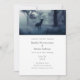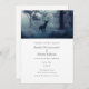 Wedding invitation with a photo of a regal deer with antlers standing in a dark forest. Snow falling all around.
