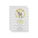 A baby shower invitation featuring an illustration of a deer inside a wreath decorated with flowers, leaves, and an acorn. Personalise the text. Background is grey chevron.