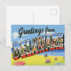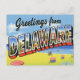 This cheerful, retro-style design captures the relaxed atmosphere of the Delaware beaches. It features the classic "Greetings from DELAWARE" typography set against a sunny beach scene with yellow sand, beach-goers, and charming coastal town architecture along the shore. This artwork is perfect for fans of vintage travel posters, retro artwork, beach vacations, and the sunny shores of the First State. It makes an excellent souvenir or gift for locals and visitors.