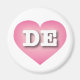 This magnet features a calm, cool pink heart with a white-washed centre containing the bold white upper case letters DE, the official abbreviation for the state of Delaware, the first state.