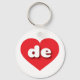 This key chain features a vibrant red heart containing the bold, white, rounded lower case letters de, a playful abbreviation for the state of Delaware, the first state.