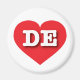 This magnet features a vibrant red heart containing the bold, white, upper case letters DE, the official abbreviation for Delaware, the first state.