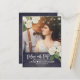 Modern Wedding Announcement Postponement Photo Postcard Templates - Elegant Script with White Hydrangeas Floral and String Lights Vintage Navy Blue Floral Linen Background.