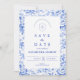 An elegant blue and white chinoiserie design inspired by classic Delft porcelain patterns. The intricate floral border surrounds a clean central panel, creating a refined and timeless look for sophisticated wedding celebrations. Delicate European toile-style artwork combined with crisp navy typography gives the design a heritage aesthetic reminiscent of fine porcelain and vintage stationery. Perfect for couples planning a classic blue and white wedding theme with traditional elegance.