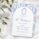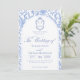 Delft blue floral wedding invitation card, designed in a refined blend of chinoiserie and French toile de Jouy style. The soft botanical illustrations frame an arched layout featuring an elegant wedding crest monogram, perfect for couples who love vintage, historic, and European-inspired aesthetics. Classic script typography pairs beautifully with the ceramic-blue palette, making this design an effortless nod to the tradition of “something blue.” Fully customizable with your names, date, and location, it’s an exquisite choice for any romantic or sophisticated wedding theme.