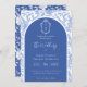 Delft blue floral wedding invitation card, designed in a refined blend of chinoiserie and French toile de Jouy style. The soft botanical illustrations frame an arched layout featuring an elegant wedding crest monogram, perfect for couples who love vintage, historic, and European-inspired aesthetics. Classic script typography pairs beautifully with the ceramic-blue palette, making this design an effortless nod to the tradition of “something blue.” Fully customizable with your names, date, and location, it’s an exquisite choice for any romantic or sophisticated wedding theme.