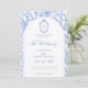 Delft blue floral wedding invitation card, designed in a refined blend of chinoiserie and French toile de Jouy style. The soft botanical illustrations frame an arched layout featuring an elegant wedding crest monogram, perfect for couples who love vintage, historic, and European-inspired aesthetics. Classic script typography pairs beautifully with the ceramic-blue palette, making this design an effortless nod to the tradition of “something blue.” Fully customizable with your names, date, and location, it’s an exquisite choice for any romantic or sophisticated wedding theme.