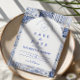 A timeless blue and white design inspired by classic Delft porcelain and French toile patterns. The patchwork tile border combines delicate florals, stripes, and ornamental motifs that evoke vintage European ceramics. A soft arched panel in the centre keeps the layout refined and elegant while allowing the details of the porcelain-inspired pattern to frame the celebration beautifully. Perfect for couples planning a sophisticated blue and white wedding with traditional European charm.