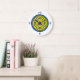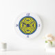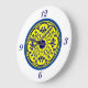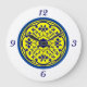 A decorative wall clock with a blue and white design with blue numbers. The gothic design on the face has a yellow background. Click Customise It to add your name or message, change background colours, even save your design for later.