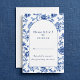 This beautiful RSVP response card features a classic Delftware-inspired blue floral design, with intricate blooms elegantly framing an arched centerpiece. The charming blue and white colour palette exudes a timeless, vintage feel, perfect for complementing a traditional or formal wedding theme. The options for “joyfully accepts” and “regretfully declines” offer a touch of refinement and personality, making this card a lovely way for guests to RSVP. Its unique arch design combined with the sophisticated floral border ensures your wedding suite will feel elegant and cohesive.