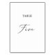 This delicate black calligraphy table five table number is perfect for a modern wedding. The romantic minimalist design features lovely and elegant black typography on a white background with a clean and simple look. The card prints on the front and back (double-sided). Other table numbers in the collection are sold separately.
