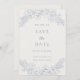 Non-photo wedding save the dates featuring elegant blue floral wreath on neutral colour background.