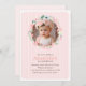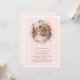 These adorable invitations feature an elegant illustration of a floral wreath in beautiful pastel colours on a thin vertical stripes background and can be personalised with your custom photo and text.