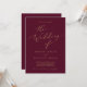 This delicate gold and burgundy all in one wedding invitation is perfect for a modern wedding. The romantic minimalist design features lovely and elegant champagne golden yellow typography on burgundy red background with a clean and simple look. Save paper by including the details on the back of the wedding invitation instead of on a separate enclosure card. Include the RSVP info as well if your guest will be replying electronically (optional).