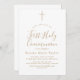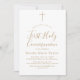 This delicate gold calligraphy first holy communion invitation is perfect for a modern religious event. The romantic minimalist design features lovely and elegant champagne golden yellow typography on a white background with a clean and simple look.