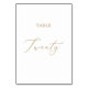 This delicate gold calligraphy table twenty table number is perfect for a modern wedding. The romantic minimalist design features lovely and elegant champagne golden yellow typography on a white background with a clean and simple look. The card prints on the front and back (double-sided). Other table numbers in the collection are sold separately.